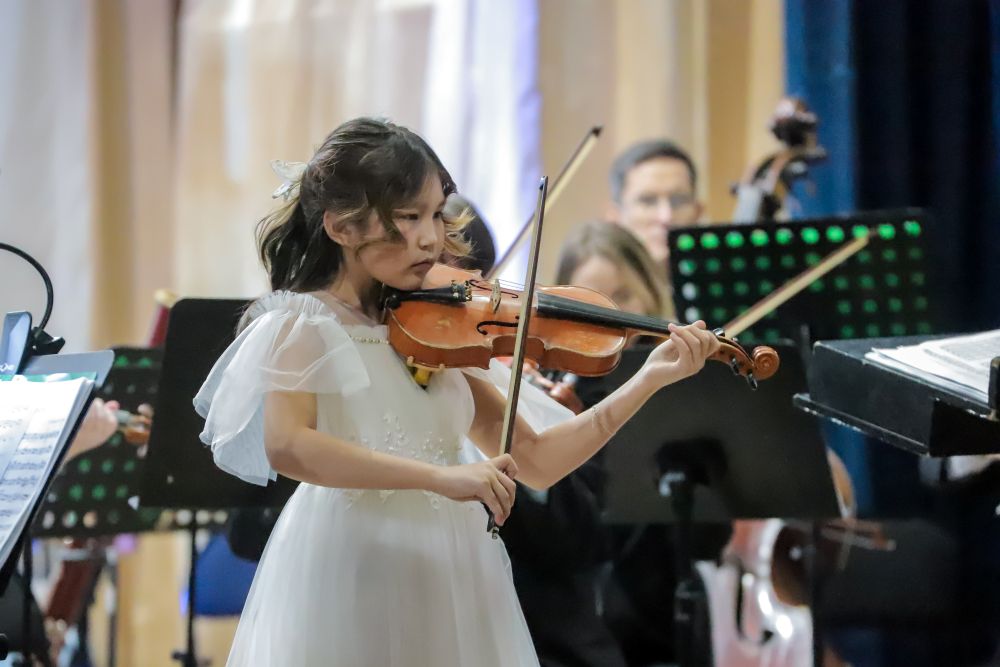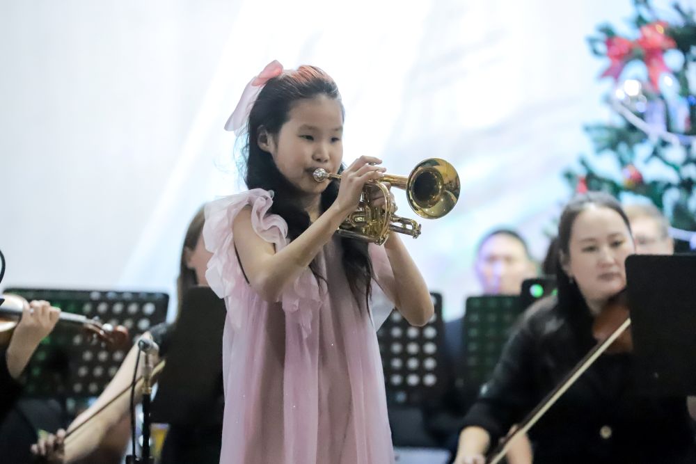 Контрастом в программе, состоявшей преимущественно из произведений для струнных, стало исполнение менуэта И.С. Баха на трубе в исполнении Урсууны Кобяковой (4 класс ВШМ, педагог Анастасия Константиновна Никулина).