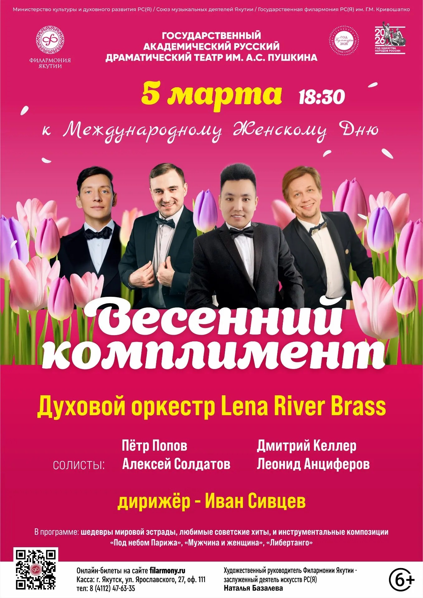 Духовой оркестр Lena River Brass Филармонии Якутии приглашает на концерт "Весенний комплимент", посвященный Международному женскому дню 8 марта.